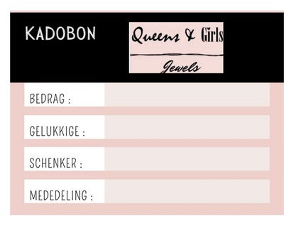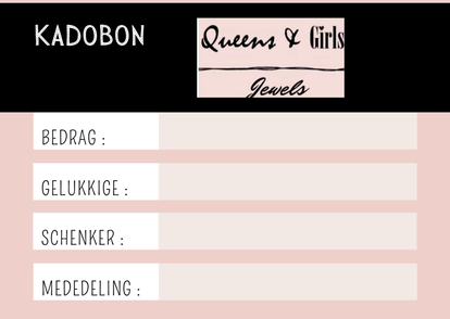 Een kadobon voor Queens&girls Jewels . Een super geschenk waar je iedereen een plezier mee doet . Ter waarde van €25