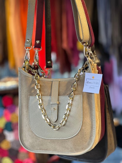 Prachtige schoudertas in een combinatie van leder en suède met 2 afneembare hengels zodat je ze ook crossbody kan dragen. Binnenkant met middenvak zodat je 3 aparte compartimenten krijgt . 100% rundleder en verkrijgbaar in 5 kleuren; taupe , camel , chocolade bruin , bordeaux en zwart